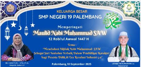 Keluarga besar SMP Negeri 19 Palembang dengan penuh rasa syukur memperingati Maulid Nabi Muhammad SAW yang diselenggarakan pada: ๐Ÿ“… Rabu, 10 September 2025 ๐Ÿ“ Aula SMP Negeri 19 Palembang &n...