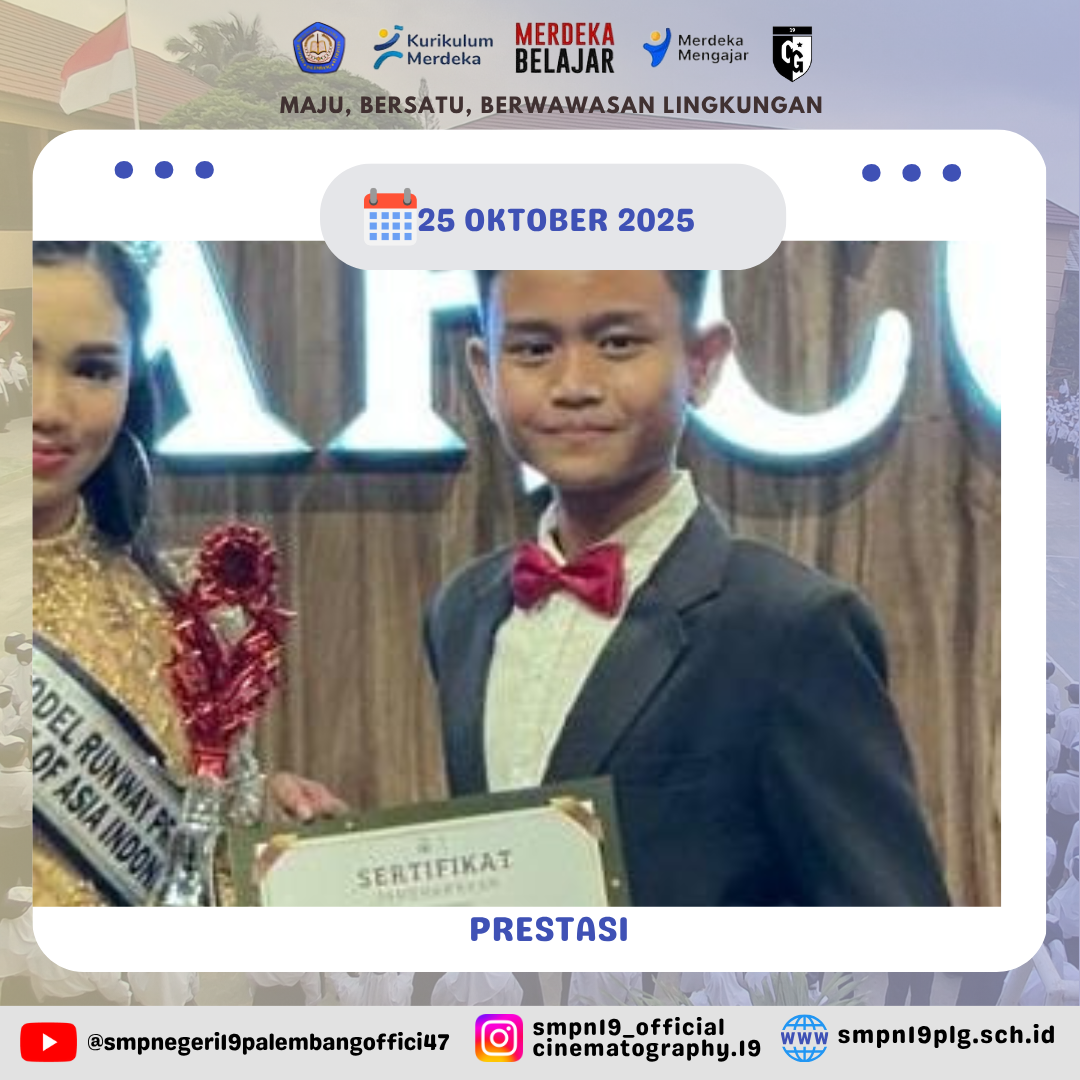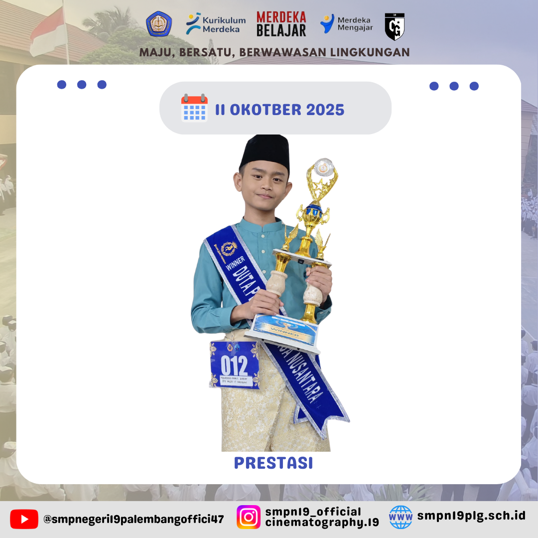 ![]() | PRESTASI Selamat kepada Muhammad Khalil Zibran (kelas 8.4) meraih prestasi sebagai “Duta pelajar remaja nusantara sumsel” dengan gelar WINNER. Yang telah dilaksanakan pada tanggal 11 Oktober 2025. |