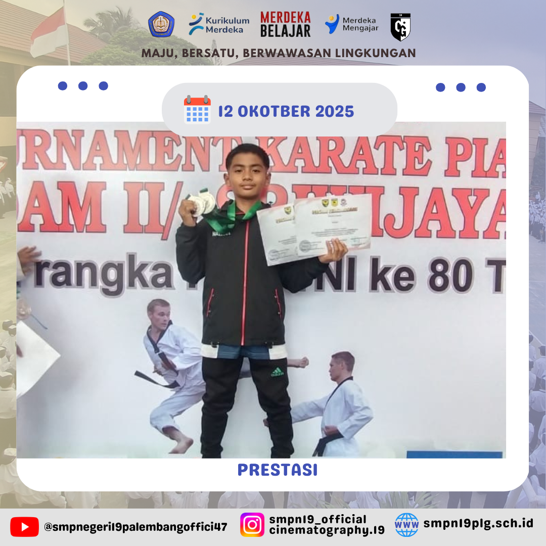 ![]() | PRESTASI Selamat kepada Dzakira Talita Zahra (kelas 7.9) berhasil meraih Juara 1 Kumite -35Kg Putri pada Kejuaraan KARATE PIALA PANGDAM II SRIWIJAYA 11-12 Oktober 2025 PSCC Palembang |