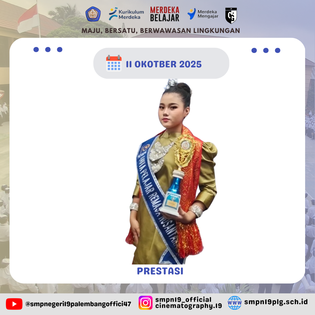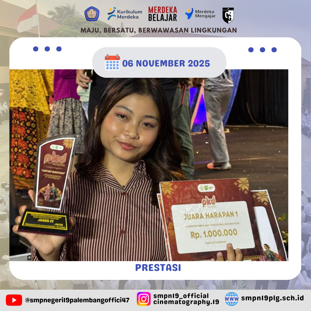 ![]() | PRESTASI Selamat kepada Cahaya Putri (kelas 9.5) juara harapan satu sekota palembang bu,dalem rangka lomba pekan kebudayaan daerah sumatera selatan November 6-11-2025 |