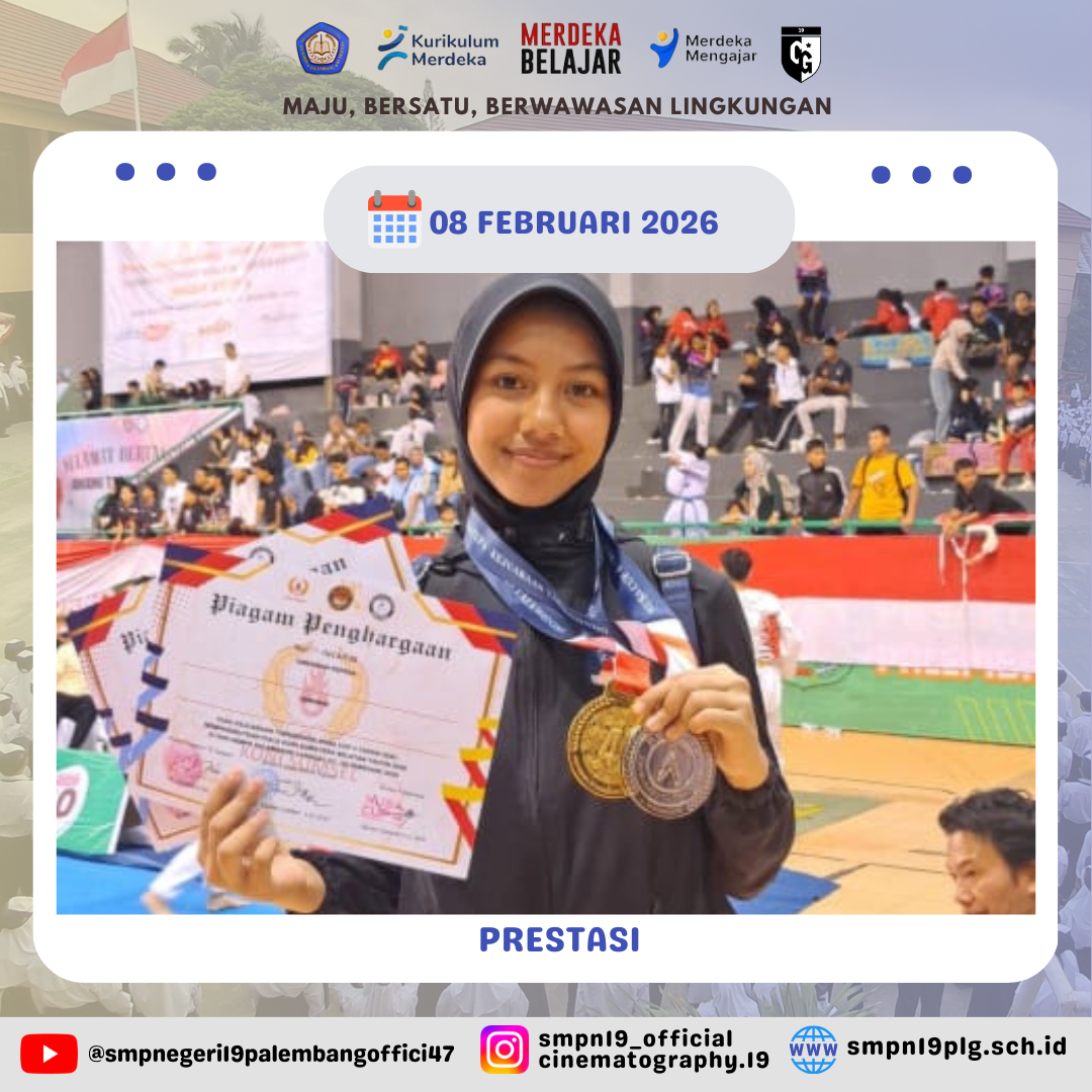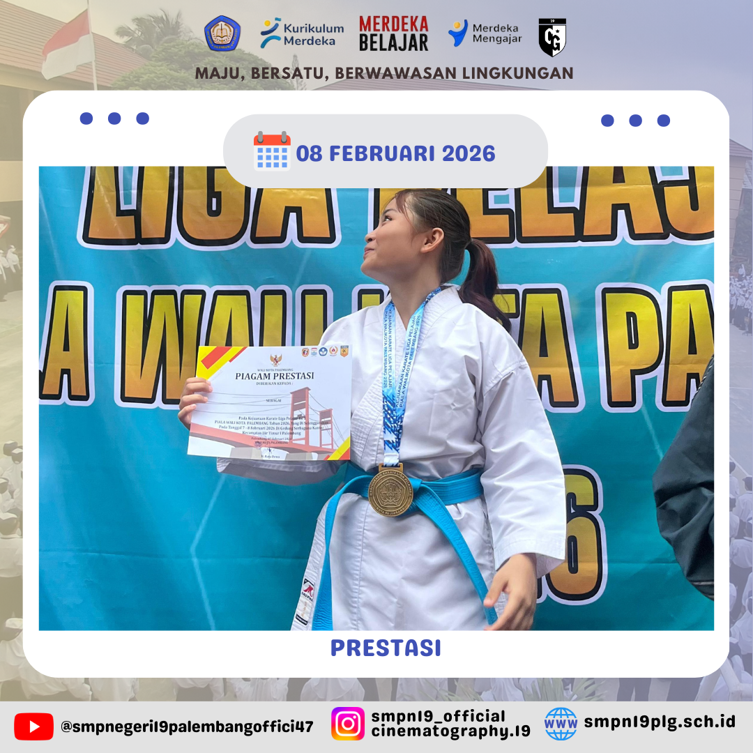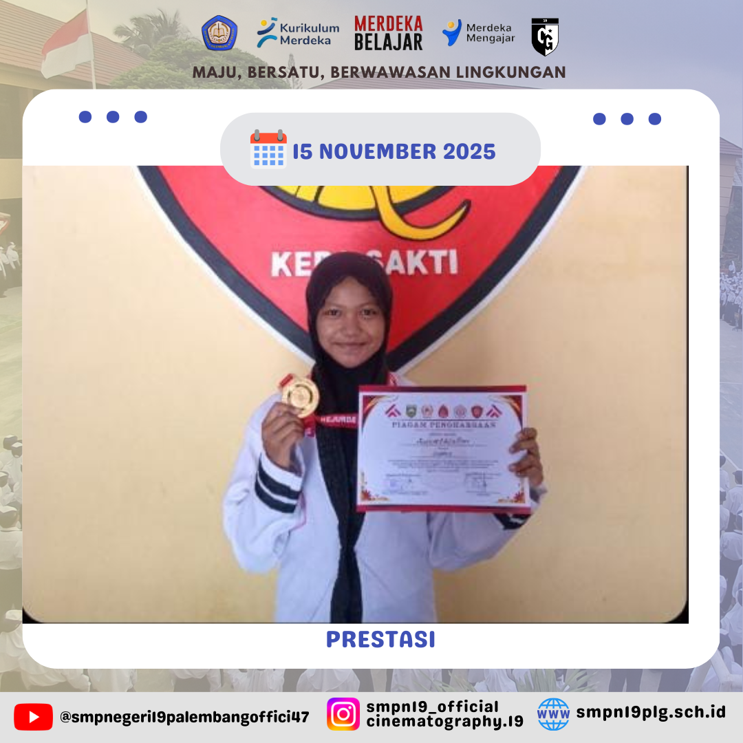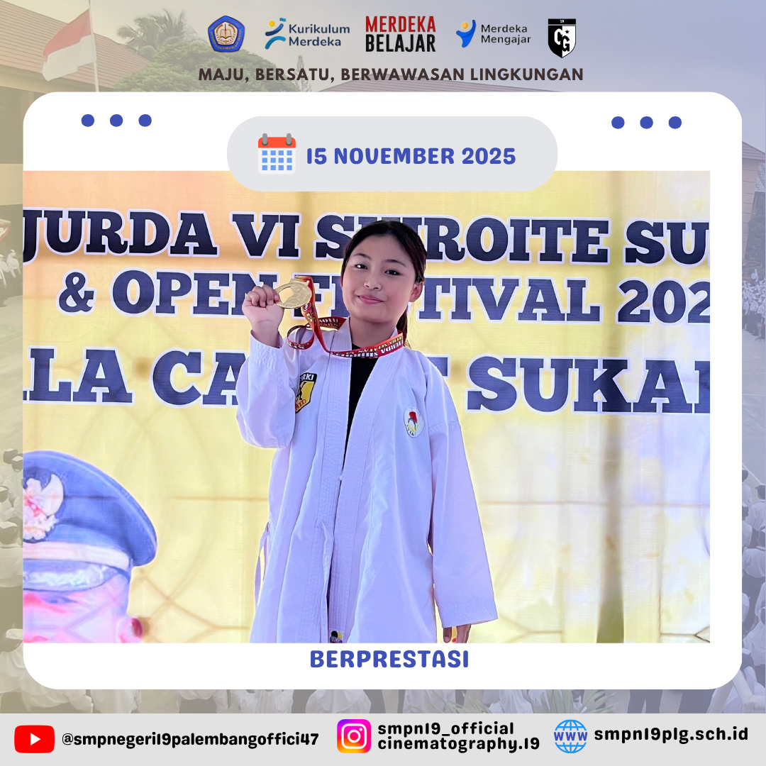 ![]() | PRESTASI Selamat kepada Saskia Adelia Putri kelas 7.11 meraih medali Emas (Juara1) pada Kejuaraan Nasional Piala Ketua Umum IKS PI Kera Sakti tahun 2025 yang di selenggarakan pada tanggal 13-15 November, di Tanjung Senai Ogan Ilir |