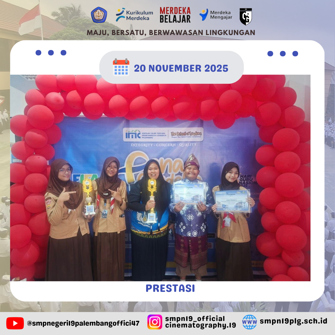 ![]() | PRESTASI Selamat kepada Cahaya Putri (kelas 9.5) meraih juara 1 lomba dalam rangkaian kecamatan sukarami kota palembang 15-11-2025 |