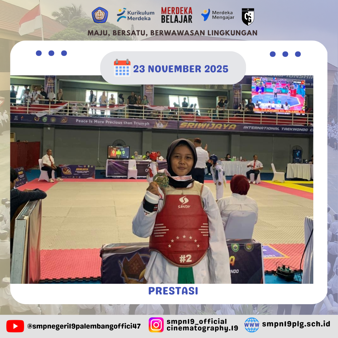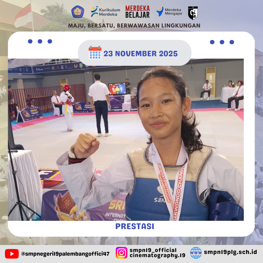 ![]() | PRESTASI Selamat kepada Afika Putri Khania kelas 8.3 kategori Pemula U41 dalam Kejuaraan Sriwijaya Internasional Taekwondo Championship 2025 meraih medali emas |