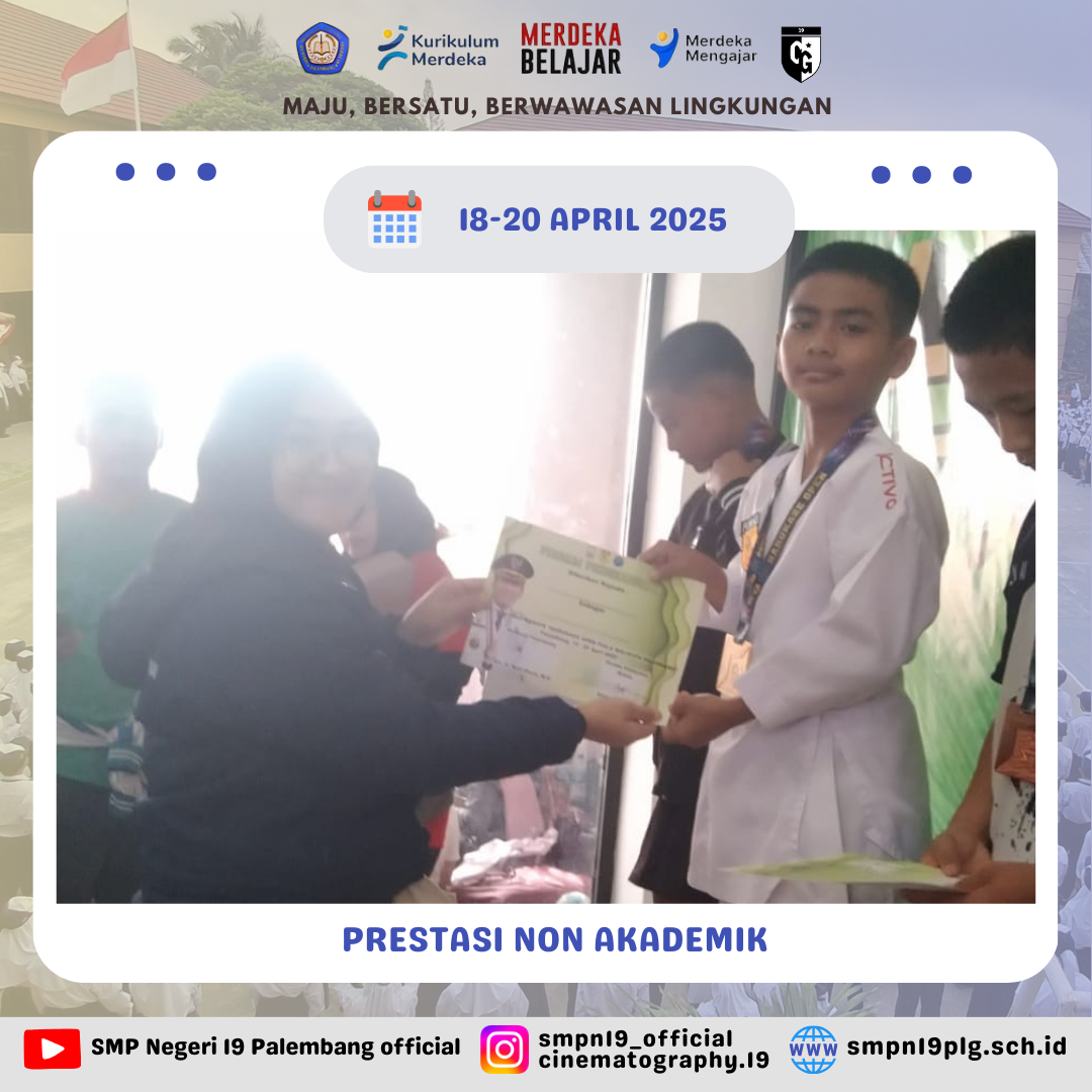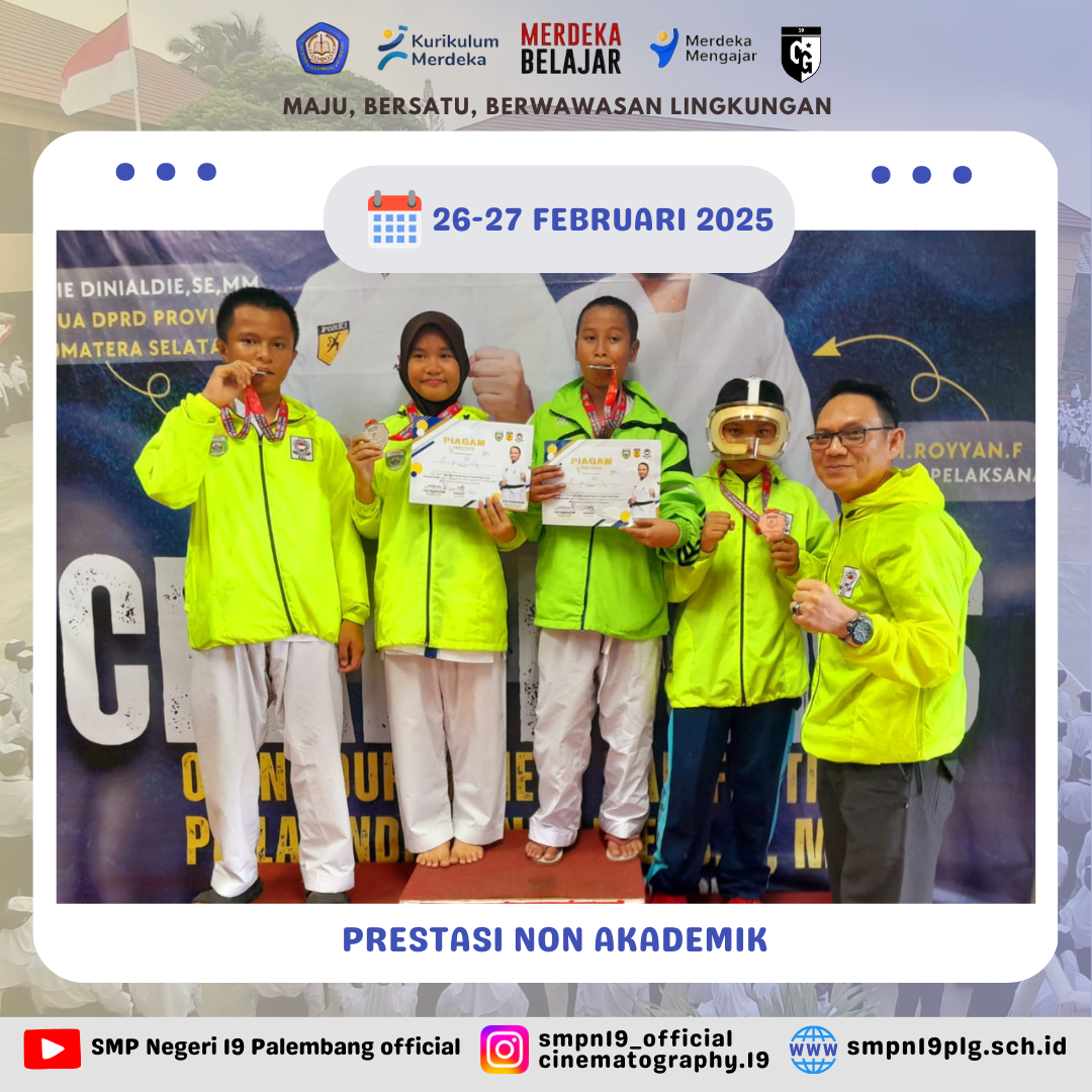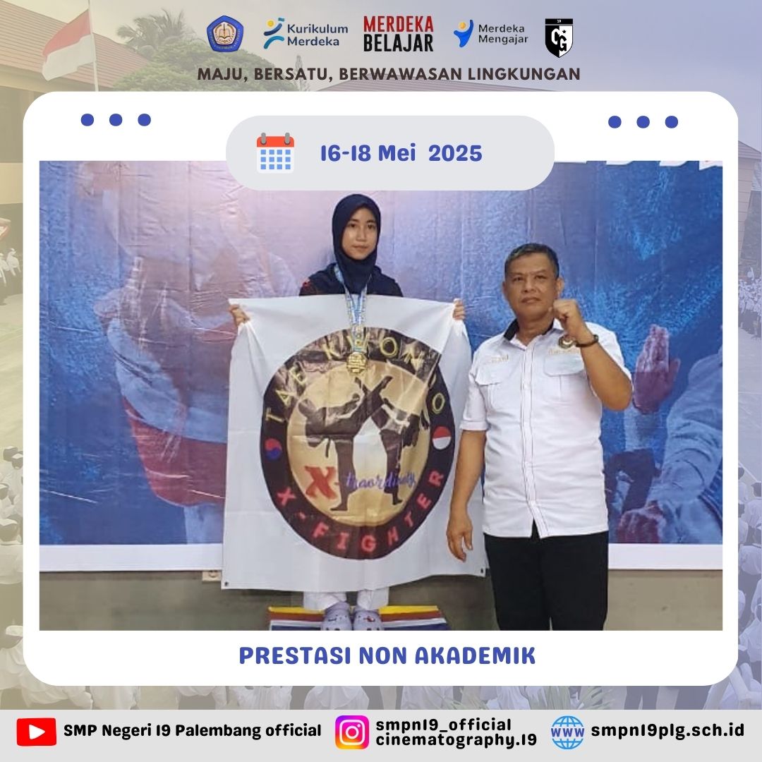 ![]() | PRESTASI NON AKADEMIK Selamat kepada Nyayu Khalifah Khairunnisa (Kelas 7.8) sebagai Juara 1 Kyorugi Prestasi Cadet Putri 33 Pada Kejuaraan Grade C 5 Provinsi MDK’S Taekwondo Championship G Sumatera Selatan 205 memperebutkan Piala Danlanal Palembang 16-18 Mei 2025. |