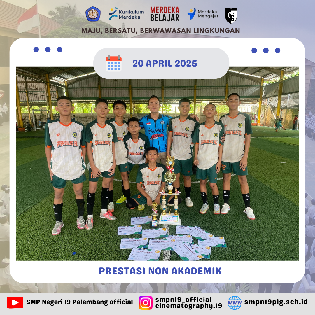 ![]() | PRESTASI NON AKADEMIK Selamat kepada Tim Futsal Putra SPENSILAS dan Pembina (Ardiansyah, M.Pd) telah berhasil meraih: 1) Gelar Juara 1 di Liga Pelajar SFL Season 6 tahun 2025 yg diselenggarakan mulai Januari sampai April di Seventh Futsal 2) salah satu siswa kita terpilih sebagai Pemain Terbaik di Liga tersebut a.n M.Fakhri Abiiyu(kelas 9.4) |