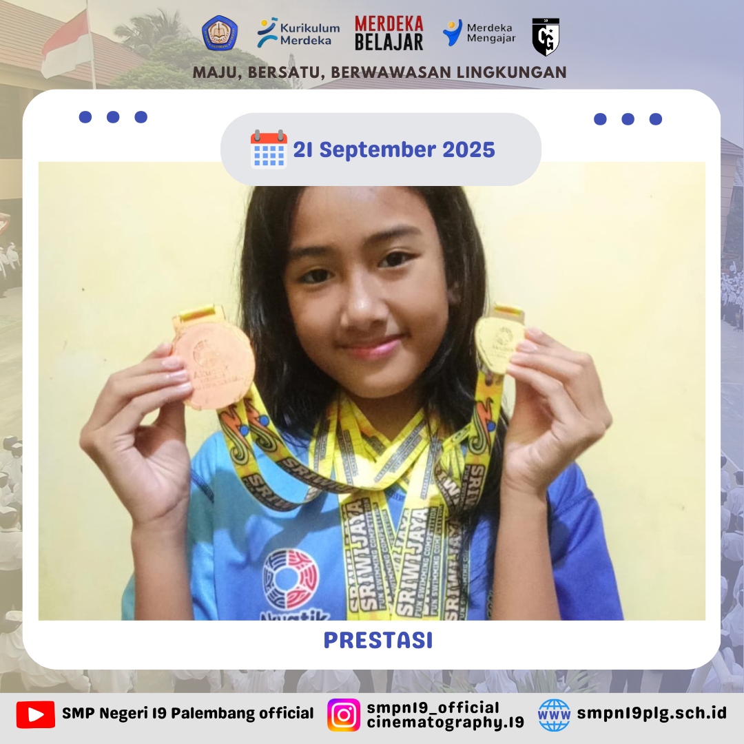 ![]() | PRESTASI Selamat atas prestasinya kepada Regina Ananda Putri ( Kelas 7.1 ) judul lomba : Sriwijaya fun swimming competition lokasi : kolam renang Jakabaring Aquatic Stadium tanggal : 4 - 7 September 2025 kejuaraan : Juara 1 Gaya bebas 25 M Juara 1 Gaya bebas 50 M Juara 1 Gaya Dada 50 M Juara 2 Gaya Dada 25 M Juara 2 Gaya Punggung 25 M Juara 2 Gaya Kupu-kupu 25 M Juara umum : Juara 3 Gaya Bebas 50 M Juara 3 Gaya Dada 50 M Juara 3 Gaya Bebas 25 M ( KU.3 PUTRI ) |