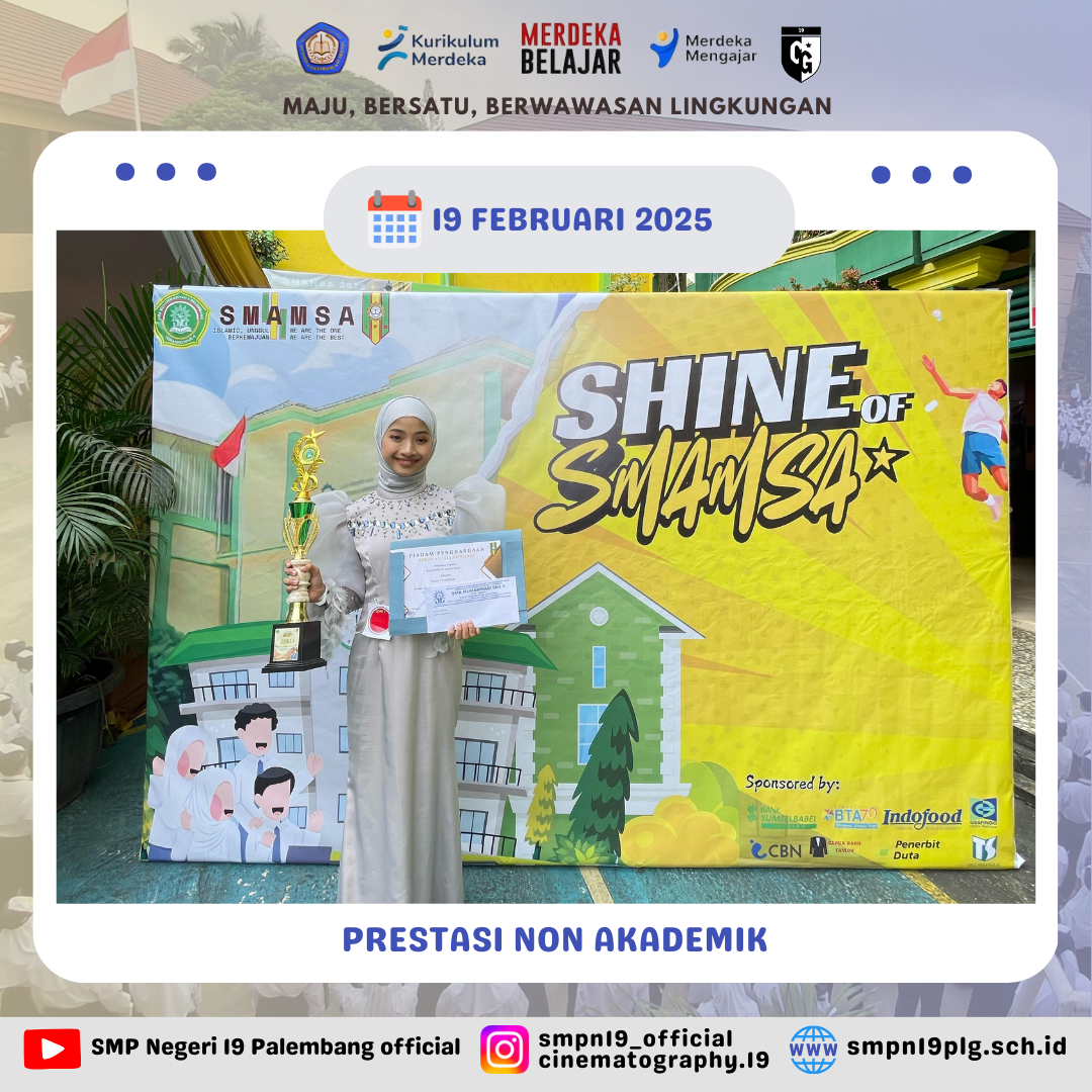 ![]() | PRESTASI NON AKADEMIK Alhamdulillah selamat aura callista Agus Wijaya kelas 8.8 meraih juara 1 vocal solo SMAMSA, terimakasih guru pendamping Ibu Widya Rizky Ananda dan Ibu Yulia Sari. |