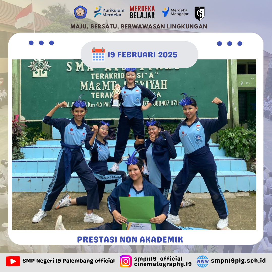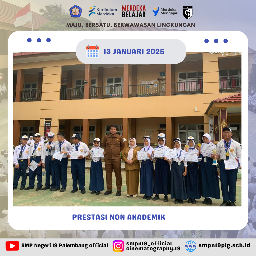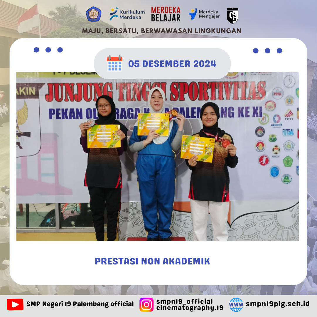 ![]() | PRESTASI NON AKADEMIK Selamat kepada tim pencak silat SMP NEGERI 19 Palembang dan Pelatih dalam kejuaraan IPSI cup tingkat nasional di gor dempo Jakabaring sport city tanggal 20-23 februari 2025: 1.m.zaidan.arrohman : 8.10 (emas) 2.piani putri lestari : 9.3 (emas) 3.putri Indri : 9.11 (emas) 4.rajwa qurrota’aini : 7.3 (emas) 5.aisyah nur afiqah : 7.3 (perak) 6.syeh Riski : 8.8 (emas) 7.siti meyliza : 8.6 (emas) 8.m.fahri Syahputra : 9.3 (emas) |