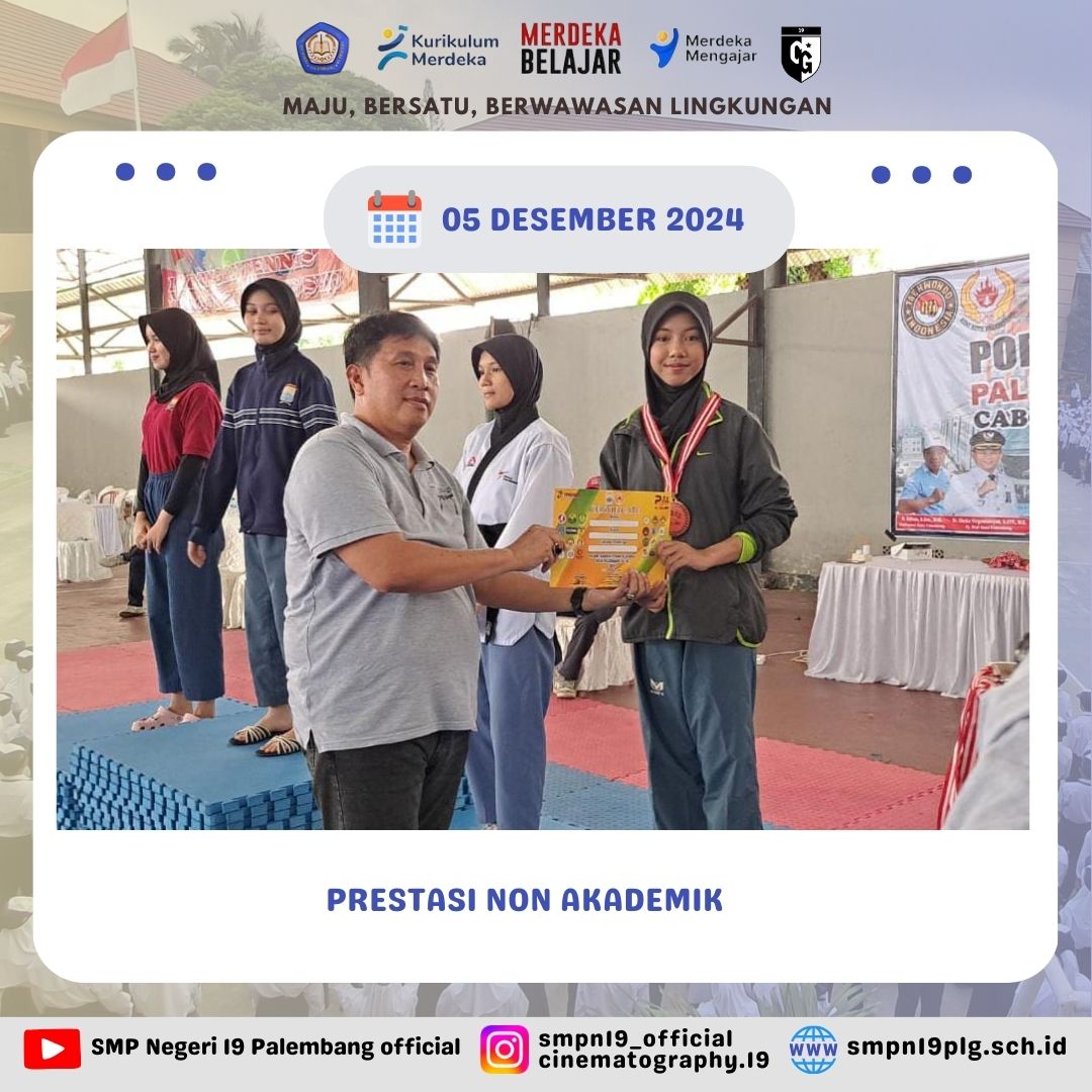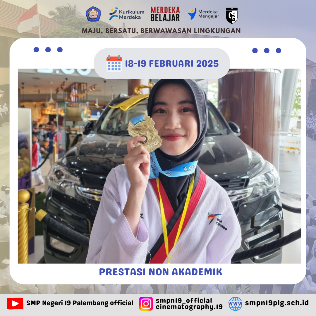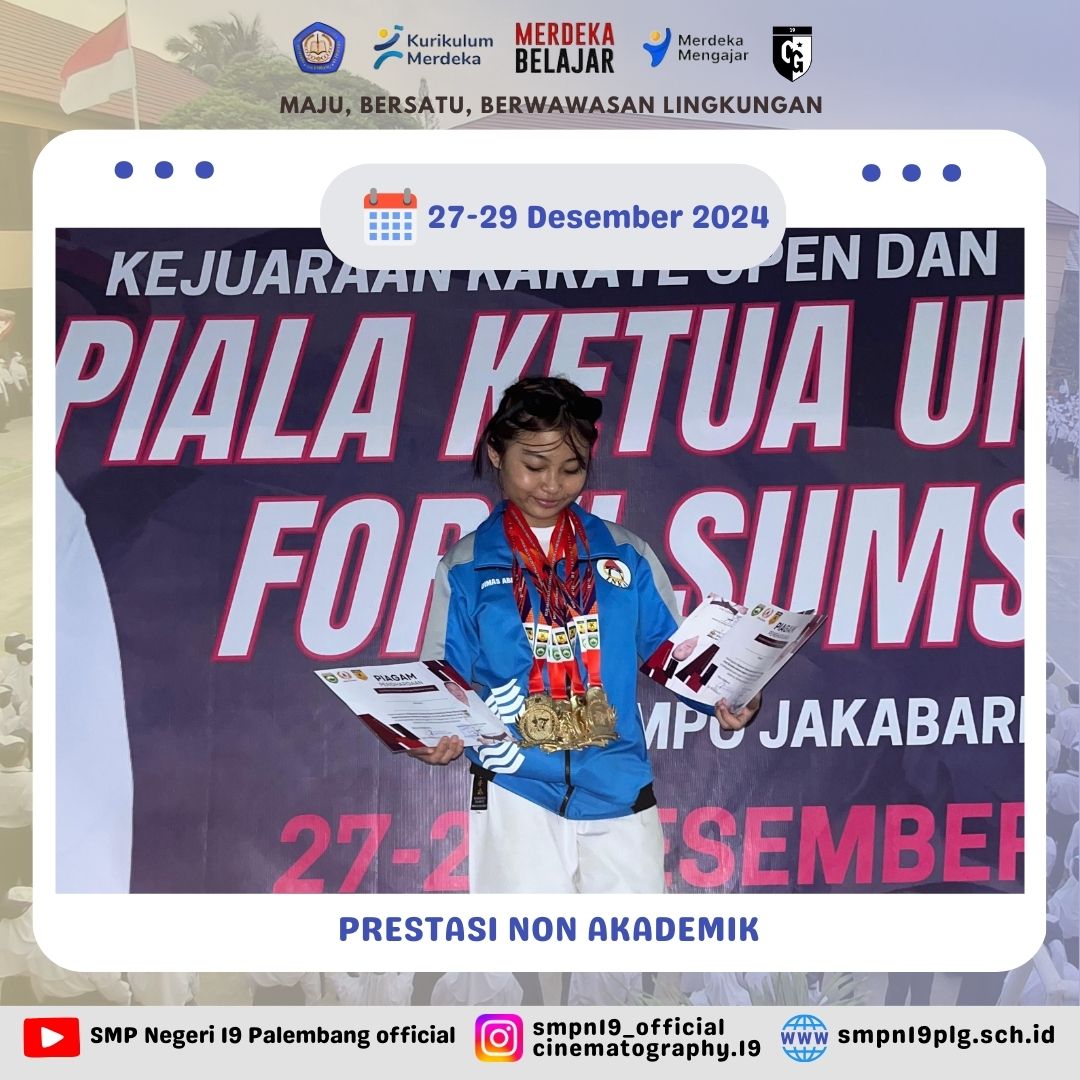 ![]() | PRESTASI NON AKADEMIK Alhamdulillah selamat kepada siswa/i SMP N 19 Palembang dalam “Kejuaraan Karate Open & Festival Piala Ketua Umum Forki Sumatera Selatan bapak Dr. R. M. Taufik Husni, S.H., M.H. Pada tanggal 27-29 Desember 2024 di Gor Dempo Jakabaring Palembang. 1. Cahaya Putri (kelas 8.5) “Juara 1 Kumite” dan “Juara 1 Kata” 2. Uziel van Askarila (kelas 8.4) Juara 1 Kumite 3. Nyayu Khalifah Khairunnisa kelas 7.8 medali emas Kyorugi cadet female kejuaraan Indonesia Taekwondo Fun Road to FORNAS VIII 2025 NTB, medali perak poomsae individual cadet putri IYOS TAEKWONDO CHAMPIONSHIP 2024, medali perunggu Kyorugi prestasi cadet putri U 33 kg IYOS TAEKWONDO CHAMPIONSHIP 2024 |