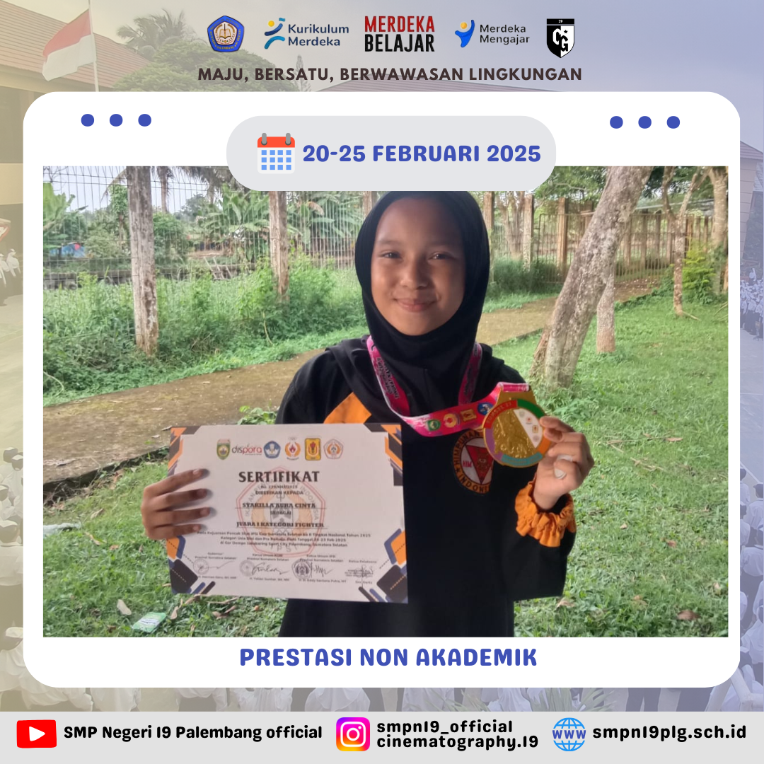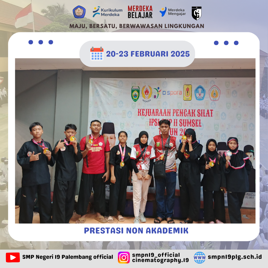 ![]() | PRESTASI NON AKADEMIK Selamat kepada Syakilla Aura Cinta kelas 7.4 Meraih emas kategori Fighter kejuaraan pencak silat IPSI Cup Sumatera Selatan ke II Tingkat Nasional Tahun 2025 20-25 Februari 2025 |