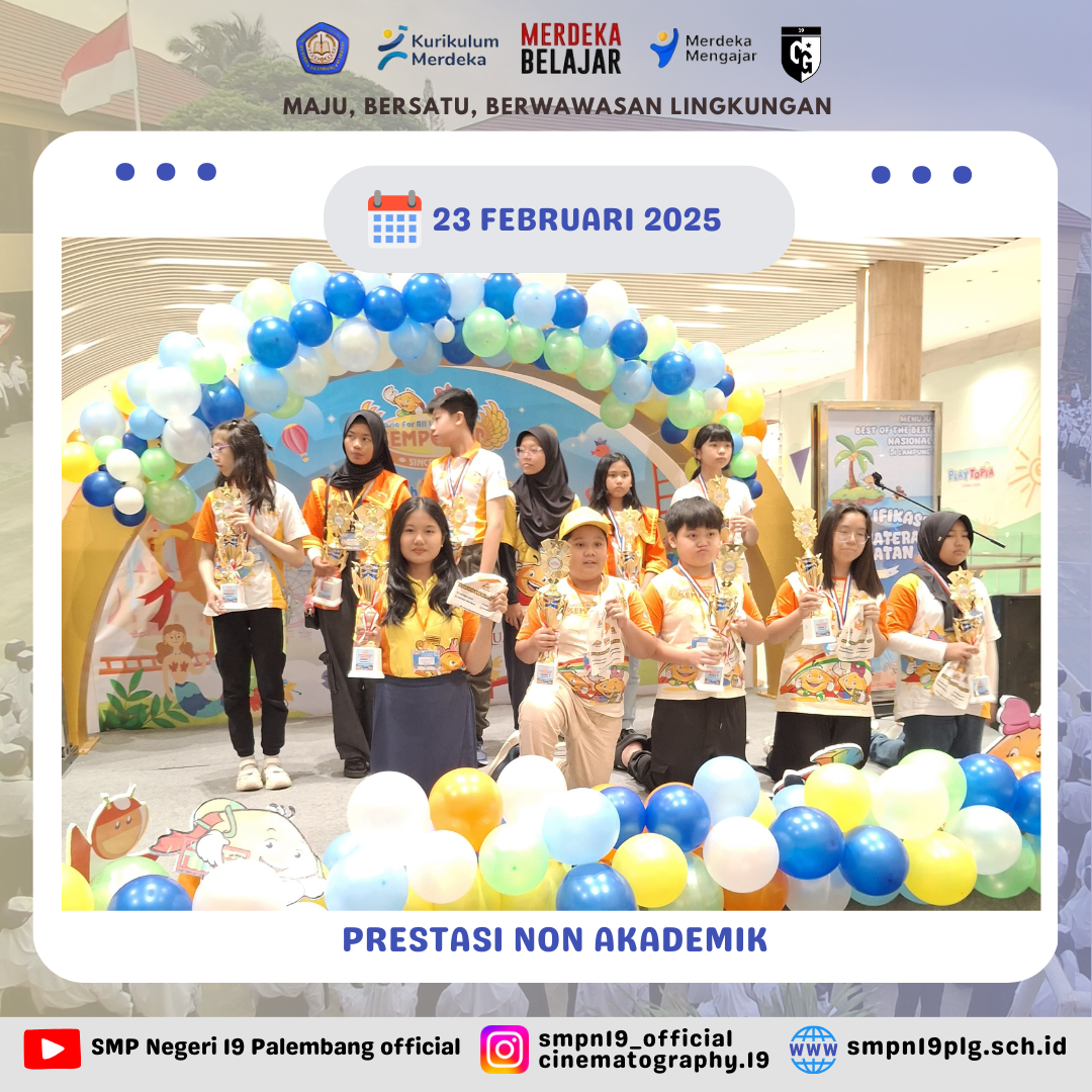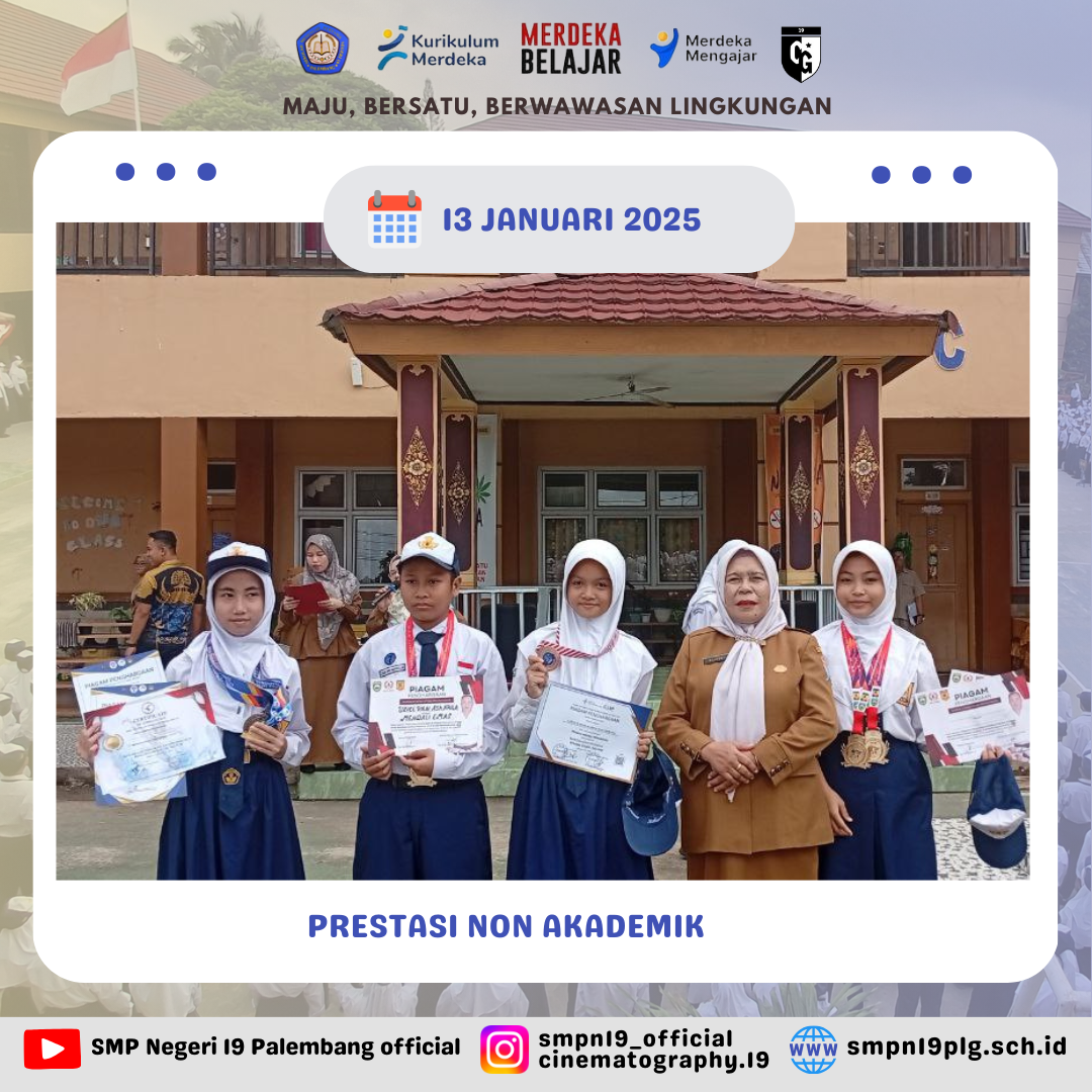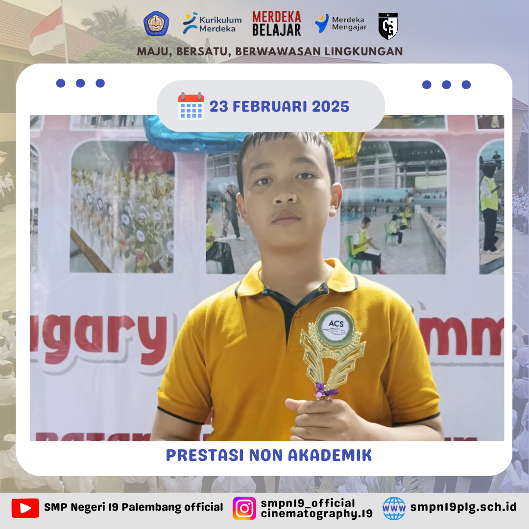 ![]() | PRESTASI NON AKADEMIK Selamat kepada M.Dzaky Almer Naufal kelas 8.4: - Juara 1 Gaya bebas 100 Putra tingkat SMP event 24 Tahun DX Almagary Challenge Swim Di Aquatic Jakabaring - Juara 3 Gaya Bebas putra 5O M tingkat SMP |