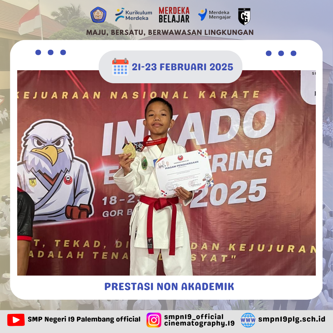 ![]() | PRESTASI NON AKADEMIK Selamat Kepada Zavy Tri Satria Kelas 8.5 Juara 1 SMP Kata Putra Kejuaraan Karate Nasional INKADO 2025 dilaksanakan di Gelanggan Olahraga Bulungan Jakarta, 21-23 Februari 2025 |